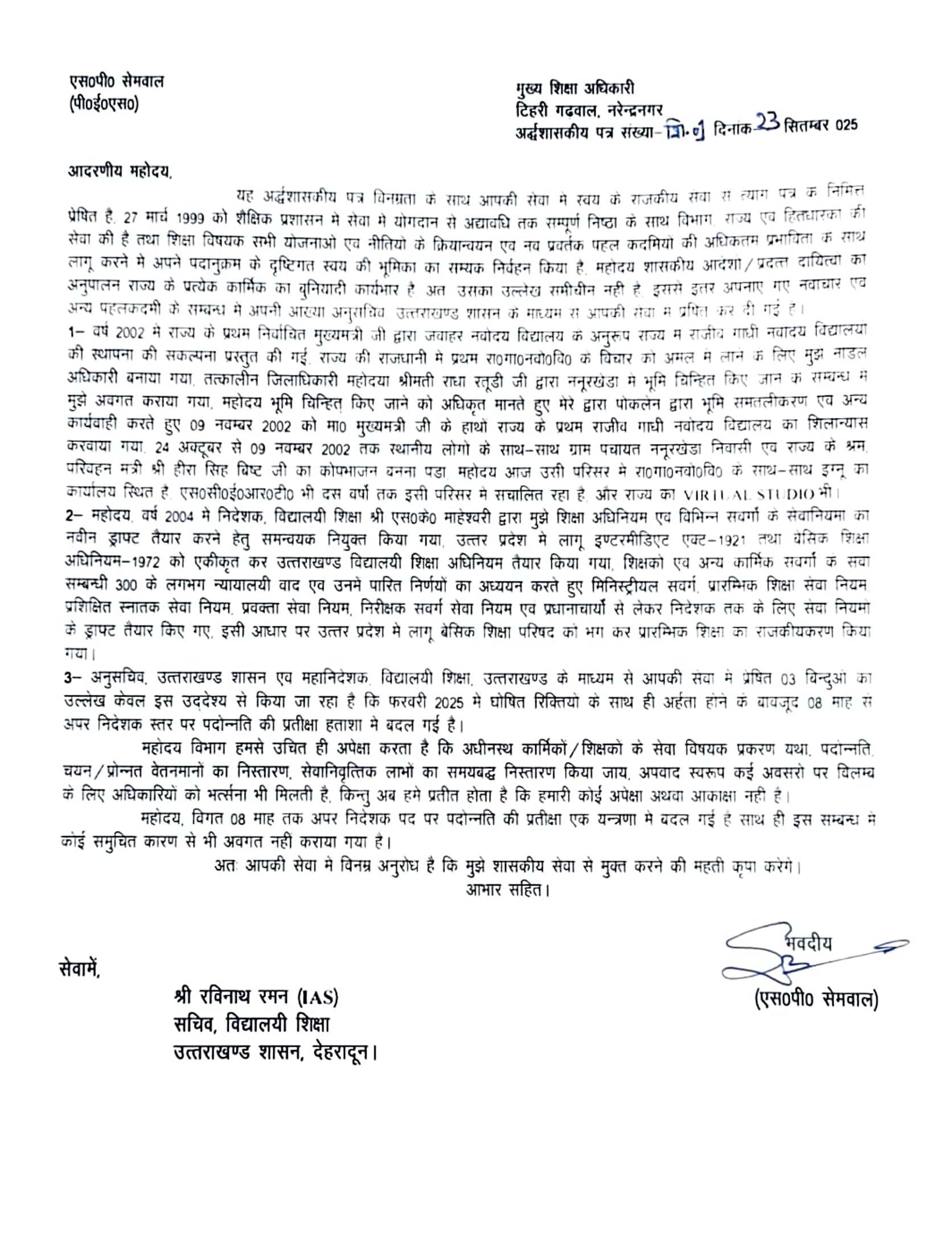 टिहरी के मुख्य शिक्षा अधिकारी एसपी सेमवाल ने राज्य के शिक्षा सचिव रविनाथ रमन को पत्र लिखा है. जिसमें उन्होंने इस्तीफे की वजह बताई है. पत्र में एसपी सेमवाल ने प्रमोशन का जिक्र किया है. उन्होंने लिखा है कि कई महीनों के बाद भी उन्हें प्रमोशन नहीं मिला है, जबकि वे इसके लिए हर अर्हता को पूरा करते हैं.