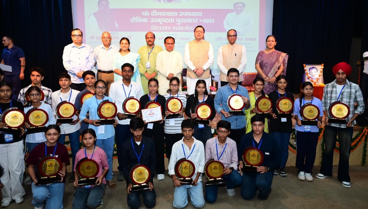 देहरादून:- मुख्यमंत्री पुष्कर सिंह धामी ने गुरुवार को नानूरखेड़ा स्थित एससीईआरटी ऑडिटोरियम में आयोजित पंडित दीनदयाल उपाध्याय शैक्षिक उत्कृष्टता पुरस्कार समारोह में बोर्ड परीक्षाओं में शीर्ष 10 स्थान प्राप्त करने वाले हाईस्कूल एवं इंटरमीडिएट के 75 मेधावी छात्र-छात्राओं को पुरस्कृत किया। इस मौके पर बोर्ड परीक्षाओं में उत्कृष्ट परिणाम देने वाले विद्यालयों के तीन-तीन प्रधानाचार्यों के साथ ही श्रेष्ठ प्रदर्शन करने वाले शीर्ष 50-50 विद्यालयों के प्रधानाचार्यों को भी सम्मानित किया।