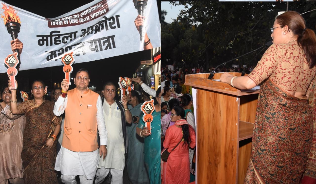 देहरादून:- महिला आरक्षण के मुद्दे को लेकर मातृशक्ति नें देहरादून में गांधी पार्क से घंटाघर तक महिला आक्रोश मशाल यात्रा निकाली। इस यात्रा में मुख्यमंत्री पुष्कर सिंह धामी और मंत्री रेखा आर्या सहित बड़ी संख्या में पार्टी पदाधिकारी और महिलाएं शामिल रहीं।