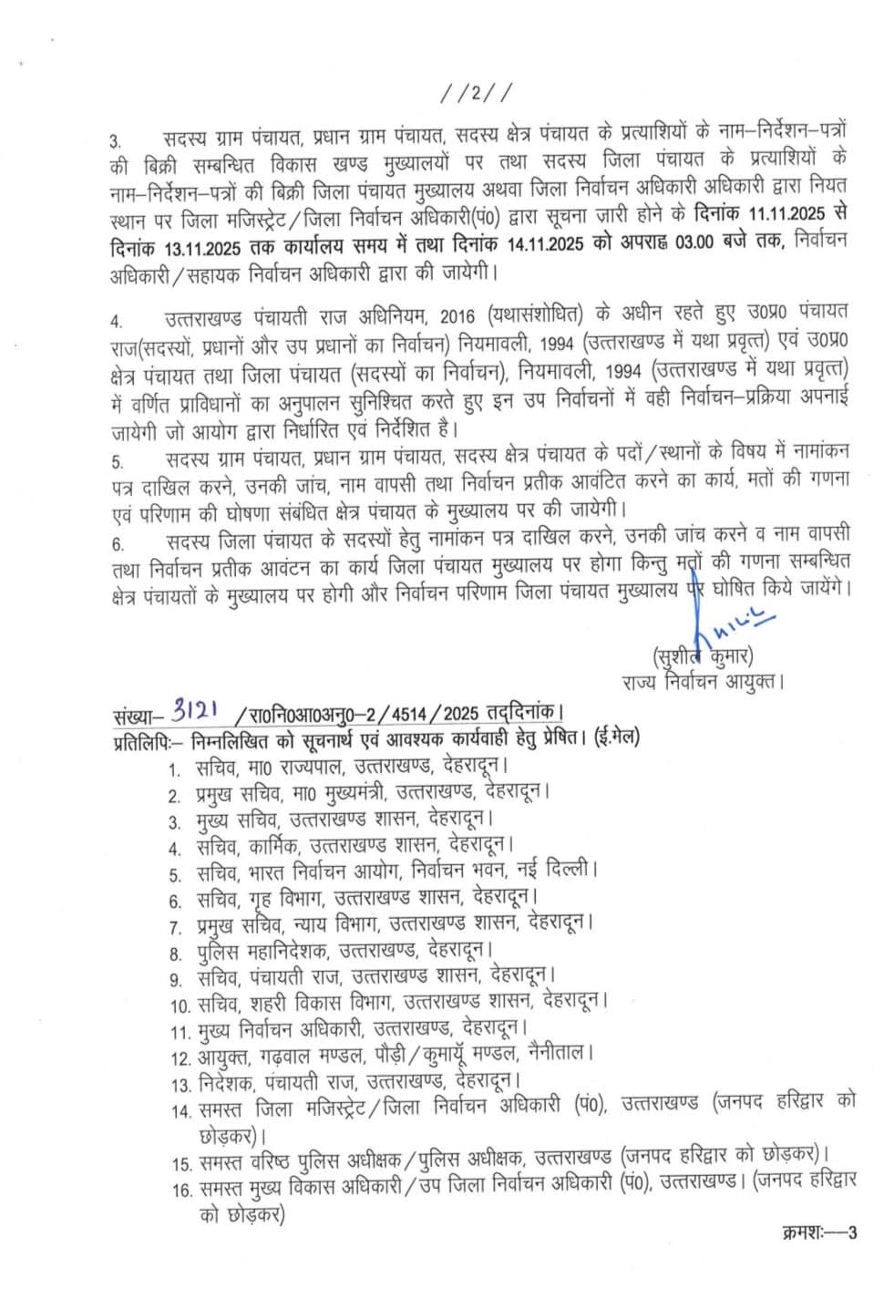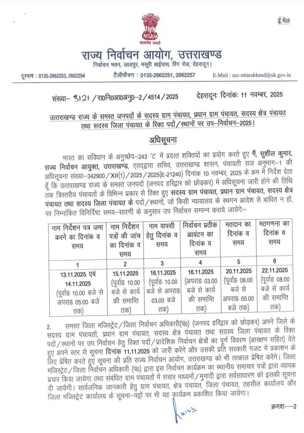 उत्तराखण्ड में त्रिस्तरीय पंचायत उपचुनाव के रिक्त पदों पर 20 नवंबर को होगा मतदान व 22 को होगी मतगणना, अधिसूचना जारी।